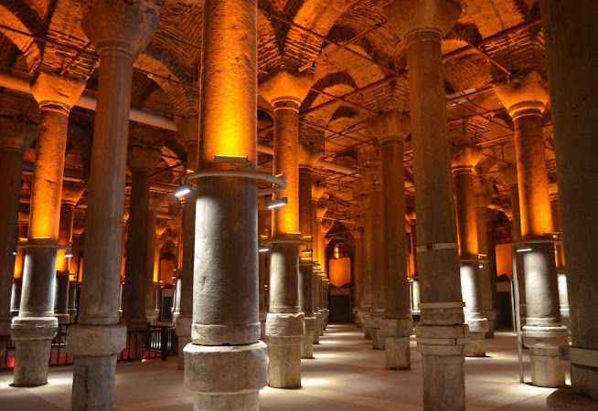 Tak to miejsce nazwali Turcy... Podziemny Pałac Jerebatan (Jerebatan Saray) - co się pod tą nazwą kryje? A kryje się miejsce fascynujące, w swoim pięknie wręcz bajkowe, chociaż nie przeznaczone w założeniu do oglądania i podziwiania... Pod miejscem spalonej podczas rewolty Nikka katedry św. Eliasza, cesarz Justynian kazał zbudować największy zbiornik wodny zwany przez mieszkańców Konstantynopola Cysterną Justyniana lub Cysterną Bazyliki. Znajduje się on rzeczywiście rzut beretem od Hagia Sofia i placu Sułtana Ahmeda, czyli dawnego Hippodromu, więc w centrum dzielnicy cesarskiej.