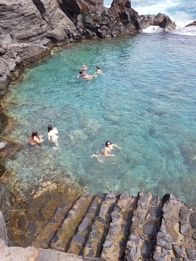 No i to prawda, Charco de la La Laja było na szczęście otwarte, chociaż na górze stał strażnik w masce i przestrzegał, żebyśmy nosiły te szmaty w trakcie zejścia do basenu. W wodzie na szczęście tego wymogu nie było... wot, i logika...